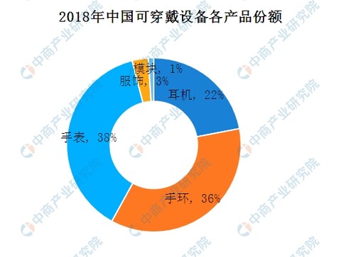 整体而言呈现出以手表、手环、耳机为主的“三权分立”局面。其中,手表所占份额最大为38%。手环市场份额超30%,耳机市场份额超20%。
