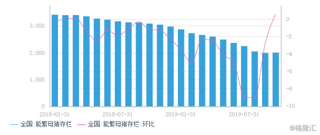 据中国政府网数据,自去年四月份开始,国内能繁母猪存栏量即从3353.37万头持续下降,至最新十月份跌至2001.07万头,同期环比增速持续为负值。但在今年10月份,能繁母猪存栏量环比小幅增加0.6%,取得十九个月来首次环比录得正增长。