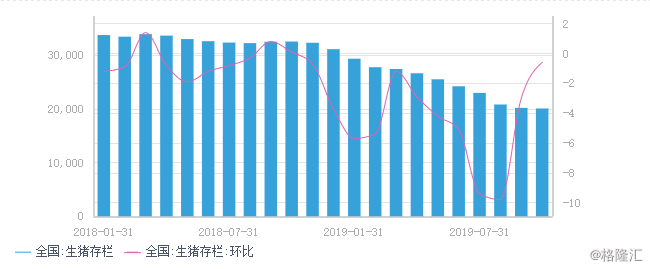 生猪的存栏量方面,自去年十一月份起,其环比增速持续为负数,且自今年三月份开始环比负增速有扩大迹象,至今年八月份探底,随后跌幅迅速收窄,至十月份生猪存栏量环比降幅收窄至-0.6%。