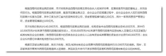 同时,西格玛贸易出具的说明还显示,本次收购价款14亿元中,由西格玛贸易出资4亿元,其中约1亿元计划来源于西格玛贸易的股东投入,约3亿元计划来源于西格玛贸易向实际控制人王爱红之兄王正郁及/或其控制的企业的借款;除西格玛贸易外的四家合伙企业合伙人以自有资金或其管理的资金合计出资约4亿元;合伙企业拟向银行申请并购贷款约6亿元。