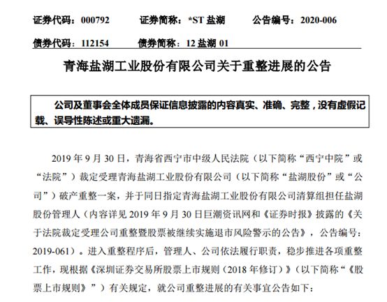 2019年9月30日,青海省西宁市中级人民法院裁定受理青海盐湖工业股份有限公司(以下简称盐湖股份)破产重整一案。